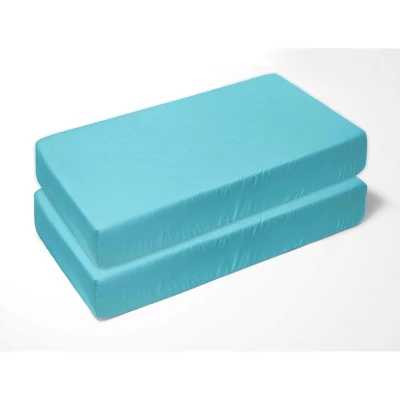 - This Bacati 10-piece Crib Set Includes Reversible Comforter/Playmat (33 x 43 inches), Two Crib fitted sheets (52 x 28 x 6 inches), Crib Skirt/Dust ruffle (13 inch drop) Diaper Stacker (holds more than 30 newborn diapers), Window Valance (15 h x 56 w inches with 1.75 inch Rod Pocket), 3 pc Wall Hangings Set and Musical Mobile in fun, colorful and signature prints in 100 percent cotton 200 Thread Count percale fabrics. Designed in United States by Experienced Designers. Many coordinating items available to purchase separately in this Bacati Aztec Print Liam Aqua Orange Navy Bedding Collection.