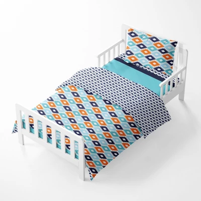 - This Bacati 4-piece Toddler Bedding Set Set Includes Reversible Oversize Comforter (42 x 55 inches), Toddler Bed Fitted Sheet(52 x 28 x 6 inches), Toddler Bed Flat Sheet(52 x 42 inches) which is fitted at the bottom to make the bed easily and Standard Pillow Case (20 x 25 inches) with french ties on the back in fun, colorful and signature prints in 100 percent cotton 200 Thread Count percale fabrics. Designed in United States by Experienced Designers. Many coordinating items available to purchase separately in this Bacati Aztec Print Liam Aqua Orange Navy Bedding Collection.