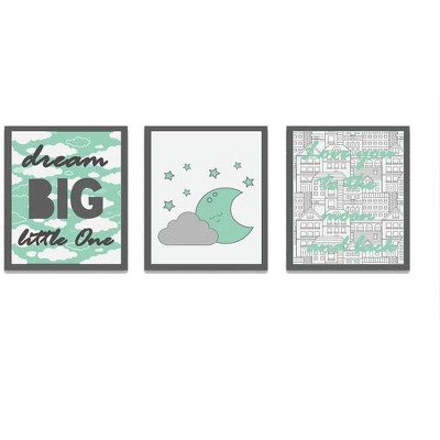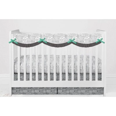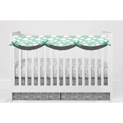 - This Bacati 10-piece Crib Set Includes Reversible Comforter/Playmat (33 x 43 inches), Crib fitted sheet (52 x 28 x 6 inches), Crib Skirt/Dust ruffle (13 inch drop) Diaper Stacker (holds more than 30 newborn diapers), Reversible Long Crib Rail Guard Cover (52 x 12 inches), Window Valance (15 h x 56 w inches with 1.75 inch Rod Pocket), 3 pc Wall Hangings Set and Musical Mobile in fun, colorful and signature prints in 100 percent cotton 200 Thread Count percale fabrics. Designed in United States by Experienced Designers. Many coordinating items available to purchase separately in this Bacati Clouds in the City Mint/Gray Bedding Collection.