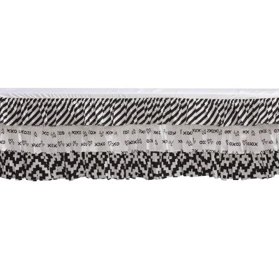 - This Bacati 4-piece Crib Set Includes Reversible Comforter/Playmat (33 x 43 inches), Crib fitted sheet (52 x 28 x 6 inches), Crib Skirt/Dust ruffle (13 inch drop) and Diaper Stacker (holds more than 30 newborn diapers) in fun, colorful and signature prints in 100 percent cotton 200 Thread Count percale fabrics. Designed in United States by Experienced Designers. Many coordinating items available to purchase separately in this Bacati Love Black Turquoise Bedding Collection.