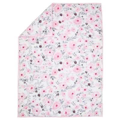 The perfect way for your little one to transition from their crib is into a toddler bed. They share the same size mattress making switching a snap. This toddler bedding set includes one quilt (42” X 57”) one fitted bottom sheet, one top sheet and one standard size pillowcase. A gorgeous floral watercolor print in pinks and grays decorates the quilt, fitted bottom sheet, top sheet, and a standard size pillowcase with a solid pink 3 ½” border. Made in a silky soft microfiber fabric this is sure to please your little toddler. The fitted bottom sheet is 28” X 52” and has elastic all the way around ensuring a safe and snug fit on a standard size crib/toddler mattress. The top sheet is 44” X 61” and the pillowcase is 20” X 31 ½”.
