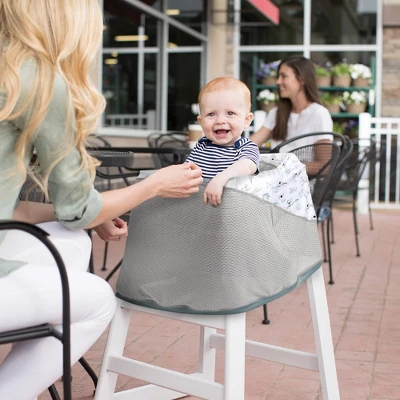Have a barrier for baby when in a restaurant highchair or a shopping cart. The stretch fabric makes it easy to fit multiple sized seats. Just be sure to pull through the safety restraint on the chair or cart.