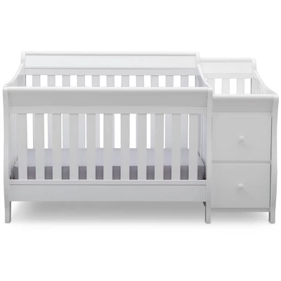 A graceful mix of style and convenience, the Bentley S Convertible Baby Crib and Changer by Delta Children will be the standout piece in any nursery. For versatility, a convertible 4-in-1 crib that easily adapts into a toddler bed, daybed and full size bed, is attached to a changing table that sits above two drawers and open shelving. The crib features an adjustable three-position mattress support and showcases a sleek sleigh silhouette that is truly timeless while the changing table includes a water-resistant pad with safety strap. From the nursery, to their big kid room, the Bentley S Crib and Changer is well built to accommodate all the stages of your child’s life.