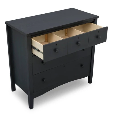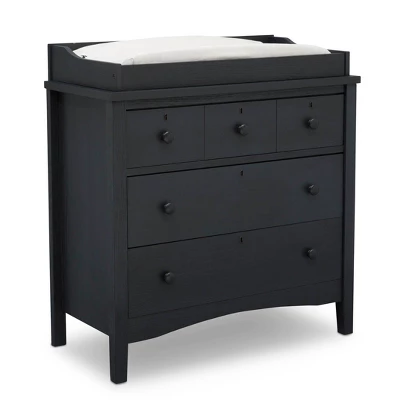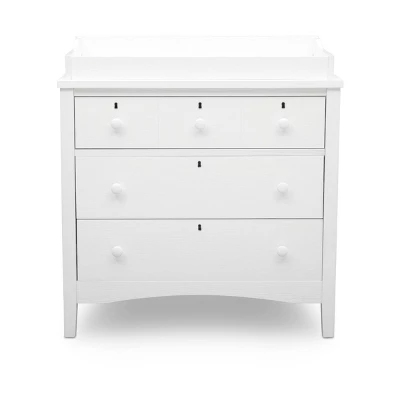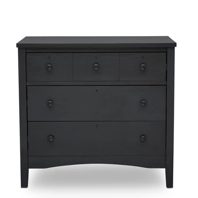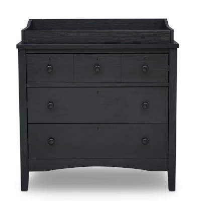 Inspired by rustic design, the Farmhouse 3 Drawer Dresser with Changing Top and Interlocking Drawers by Delta Children is set atop short, tapered legs, finished with a lightly textured technique, and accented with wood drawer pulls and keyholes. A great option for your baby’s nursery or kid’s bedroom, it features three large drawers that provide ample storage space, and it comes with an included changing top that converts the dresser into a convenient changing table. When your child no longer needs a changing table, just remove the topper to reveal a more adult storage piece. For your child’s safety, this dresser is outfitted with an interlocking drawer system that limits the number of drawers that can be opened at one time. Available in Textured Limestone, Textured White, Textured Midnight Gray. This dresser coordinates with other items in the Delta Children Farmhouse Collection.