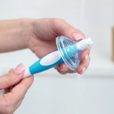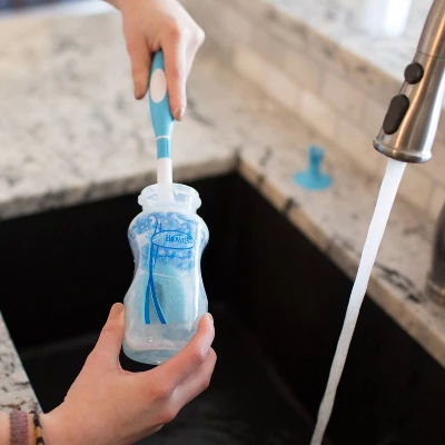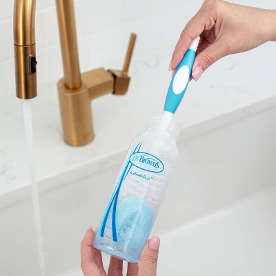 Cleaning baby bottles is easier than ever with Dr. Brown’s™ Bottle Brush. Designed to fit all Narrow and Wide-Neck Dr. Brown’s® bottles, this bottle brush features a combination bristle and sponge head to thoroughly scrub baby bottles clean. The grooved, no-slip handle features ridged chevron channels at the base designed specifically to clean nipples with ease. Includes a suction storage clip to keep the brush conveniently near the sink. Safe for use in dishwasher (top rack only).