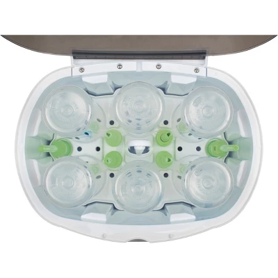 One run and done! Sterilize up to six baby bottles at once, plus parts, pacifiers and more with Dr. Brown’s™ Deluxe Bottle Sterilizer. Electronic controls with cycle indicators make this countertop baby bottle sterilizer easy to use and operate. Set it and forget it with the auto shut-off feature! A removable tray on the inside is designed to position baby bottles perfectly, while the built-in accessory tray holds bottle parts, nipples and pacifiers. The measuring cup makes it easy to add new water and included tongs keep bottles and parts clean and your hands safe.
