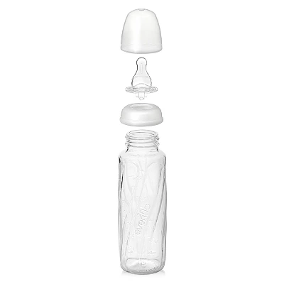 The Evenflo Feeding Vented + Glass Bottle delivers a twist on an iconic, classic design. This glass bottle is recyclable, sustainable, and Mother Nature approved. The unique, ergonomic shape is easy-to-hold, making feeding time comfortable for both you and your baby. The included Vented + Slow Flow Nipples are 100% silicone and feature micro air vents to help prevent nipple collapse. The nipple has a gradual transition between nipple length and base to allow your baby to maintain their latch. The Vented + Glass Bottles have molded measurement markers in both ounces and milliliters to provide an easy and accurate way to measure the volume of liquid. These dishwasher-safe bottles (top rack only) are compatible with all Evenflo Feeding breast pumps, as well as most other standard neck breast pump brands. The bottles and nipples are 100% free of BPA, polycarbonates, PVC and phthalates, and are also made of FDA-approved food-grade material.