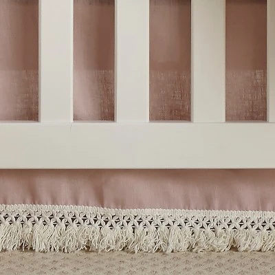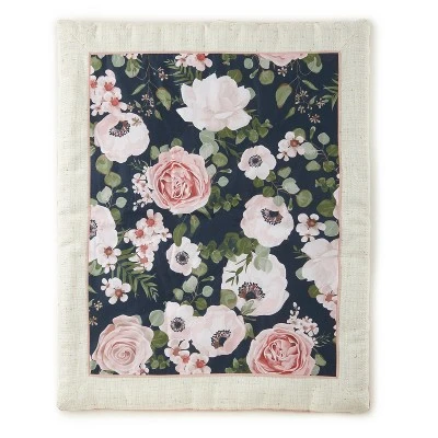 - ADORABLE FLORAL THEME: The fitted sheet is tossed flowers in pink and charcaol with green leaves on a white ground, or switch it out with the one featuring . The quilt features bold flowers and leaves stitched onto a cream border with pink piping. The bedskirt has a pretty pink fabric trimmed with a cream tassel lace, while the large nursery wall decal depicts an array of bold beautiful flowers with leaves in various sizes, completing your bold floral nursery look.