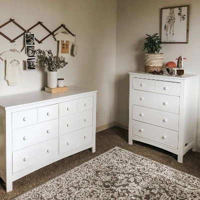 The Graco Benton 6-Drawer Double Dresser is a universal, space-saving dresser that will elevate the look of your nursery or bedroom. The Benton features a new, easy, time-saving assembly process that involves less steps and tools. The Benton’s top two drawers provides parents with easy access to frequently used nursery items, while the 4 deeper organizer drawers provide plenty of storage space. Also, the Benton’s universal design means that it will coordinate with any nursery, no matter your style. Like all Graco dressers and chests, the Benton 6 Drawer Dresser is expert tested to meet all applicable federal safety standards for the category to ensure the safest environment for your child and is compliant with anti-tipping standards. Constructed with high-quality wood and composites and featuring durable steel drawer hardware, this Graco dresser is built to last and provide years of use.