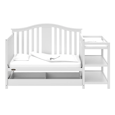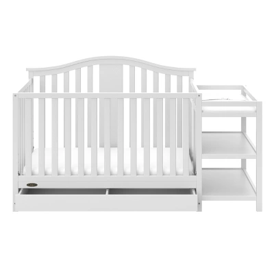 Featuring an attractive bell-shaped headboard and functional design, the Graco Solano 5-in-1 Convertible Crib and Changer with Drawer will give your nursery the elegance and convenience it deserves. This combination crib with changer provides a space-saving solution with attached changing table with two open shelves, a changing surface complete with a vinyl changing pad, and a large storage drawer underneath the crib.