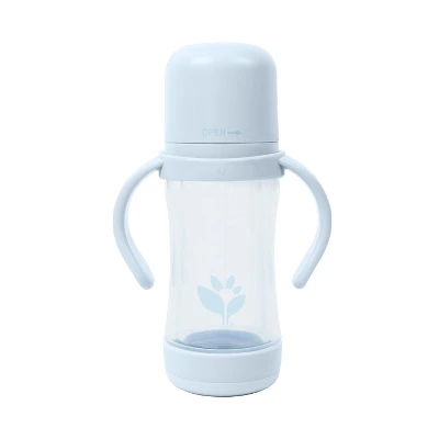 Easily and safely transition your little one from breastfeeding and bottle-feeding with our new & improved green sprouts Glass and Sprout Ware Sip & Straw. Liquids in our sip & straw cup touch only the safest materialsglass, silicone, and our Sprout Ware plant-plastic, which is a non-toxic, lightweight, durable, and recyclable material made without PVC and hormone disrupters like BPA for babys health and safety. Our redesigned non-toxic sippy cup now has a sleeker outer plastic shell and thicker shock-absorbing base to help provide additional security against glass breakage. To ensure the highest standard of protection, a silicone safety shield has also been included to prevent glass from entering the sippy or straw spout and additional safety outlets have been included at the base of the cup to notify adults of leaks if the glass breaks. Always check the cup for cracks or damage after drops and before and after each use. Our popular silicone sippy and straw spouts now feature an updated spout design that allows baby to regulate the flow with ease, and liquids can pass through when pressure is applied for less mess! The straw spout encourages proper oral development as your little one grows, and the removeable straw allows for two drinking options, traditional or tilted positions. All parts are dishwasher safe, and the silicone and glass insert are sterilizer safe for convenience. The larger 5-ounce size is made from a thicker glass and is perfectly sized for babies 6 month and older.