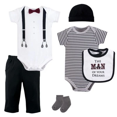 Little Treasure layette set is the perfect starter set for your little one. Our layette set includes two bodysuits, a pant, a bib, socks, and a cap for boys or headband for girls. Our mix and match set makes dressing your baby easy with multiple adorable outfits in one set. Little Treasure Baby Boy Layette 6-Piece Set, Man Of Your Dreams is a great baby essentials set for your little one.