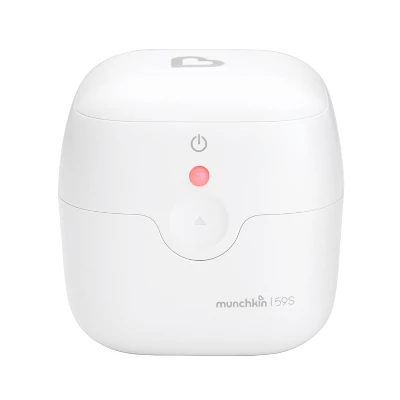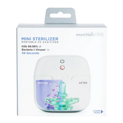 Babies drop things in dirty places at the worst times. The portable Mini Sterilizer sanitizes pacifiers, bottle nipples, and more in under a minute so you can be on your way anywhere. The Mini Sterilizer safely eliminates 99.9% of germs, bacteria, viruses* including (ATCC VR-740, Strain 229E) – a seasonal strain from the same family as -19 using just UV light and has been tested by independent labs. No chemicals, heat, or water needed! The Mini Sterilizer’s 4 gold-plated UV LED lights are mercury and ozone free and auto shuts-off when the lid is opened. This small device is easy to throw into (or attach to) a purse or diaper bag, so when you need it, it’s right at hand. Perfect for use in the home, but extra handy for public spaces such as daycare, playgrounds, doctor’s offices, airports, and more! UV light is a safe and proven method of killing bacteria that is used by hospitals to sanitize everything from operating rooms to surgical equipment. Munchkin has partnered with 59S, the leader in UV LED technology, to develop convenient, UV-based sterilizing solutions that help families with young children lead healthier lives.