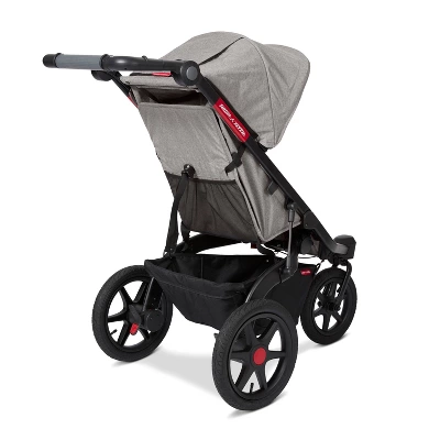 Whether you run every day or enjoy casual strolls around the neighborhood, the Momentum Jogging Stroller makes any adventure a breeze. The stroller has two steering modes: Run with a locked front wheel or Walk with a swivel front wheel. When you want to turn while in Run mode, Quick Switch™ Steering allows for on-demand steering – simply twist the handlebar to unlock the front wheel to turn without missing a beat. The handlebar also features a comfort grip, wrist strap for safety while jogging, and is height adjustable. The convenient one-hand fold allows easy storage, and this unique folding mechanism allows this jogging stroller to fold more compactly than others. Thoughtful child features include a reclining seat, 5-point safety harness, internal snack pouches, and an extendable canopy with a peek-a-boo mesh window. The extra-large storage basket provides ample space for diaper bags or backpacks. The basket also features a zippered pocket to keep smaller items safely stowed away. Maximum weight capacity 50 lbs. Recommended for kids 6 months and up.