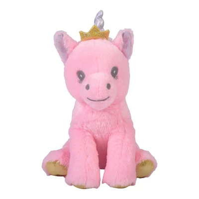 Plush Toy is pink unicorn with a gold crown and is made of soft plush pink fabric. Measures 9 inches tall.