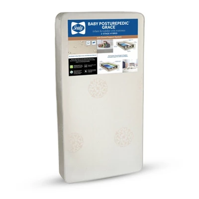 Sealy Baby Posturepedic infant and toddler crib mattresses provide one-of-a-kind targeted support with the Posturepedic® Advanced Zone Support System. The targeted areas create support and comfort where infants and toddlers need it most. Center zones target the sweet spot, where infants are placed in their cribs, offering enhanced firmness in the middle of the mattress. Comfy layers are added to the toddler side plus extra head and foot support for active toddlers. The Sealy Baby Posturepedic Grace Hybrid model is upgraded as a coil and foam “hybrid” similar to adult mattresses. This offers extra comfort and pressure-relieving feature like the hypoallergenic soy-enhanced memory foam cushioning that safely senses and responds to your child’s movement for contouring comfort. American-made coils and foam are tested for lasting durability.