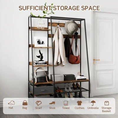 Are you looking for a versatile coat rack to well organize your stuff? Our multifunctional hall tree will be a perfect storage solution. It has 9 dual hooks,6-tier shelves,2 foldable dressers,1 shoe bench and 2-tier shoe rack,allowing you to hang or place your hats,bags,clothes,shoes and more. Besides,you can sit on the bench to conveniently change shoes or use it as an ordinary storage shelf. If you need more space to display your ornaments,you can easily remove the fabric dressers. Also,our coat rack is made of solid steel and engineered wood materials,which is strong and durable enough to serve you and your family for a long time.