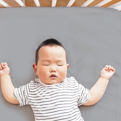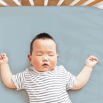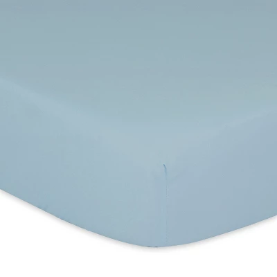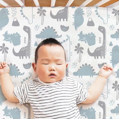 Add instant style to any nursery with the four-pack crib fitted sheet set by The Peanutshell. This collection features two printed and two solid sheet designs in a fun and vibrant dinosaur theme. The cute and playful artwork of blue and gray dinosaurs is tossed with palm trees and volcanoes on a crisp white background. The solid blue and gray sheet options compliment most baby boy nurseries. Our microfiber fabric is as soft as it is stylish. The breathable and comfortable material is gentle on baby’s delicate skin. Each sheet has elastic trim around all 4 sides for a safe and snug fit on standard 52 in x 28 in. crib mattresses. Designed to be fade resistant and machine washable for easy care. Machine wash on cold with like colors on a gentle cycle and tumble dry on low heat to best preserve this quick-drying material.