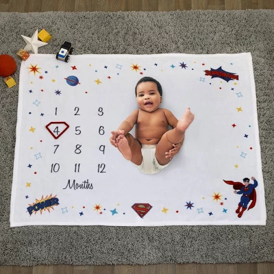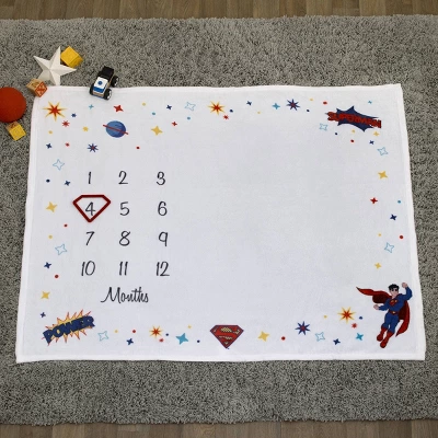 The Superman Milestone Blanket is perfect for your little superhero! Made with super soft snuggly fabrics to keep baby comfy! Featuring a white ground with icons, stars and Superman himself. This blanket is designed to create the perfect photo opportunity by capturing baby’s milestones and special moments. Measures 40″ x 50″. Machine washable for easy care!
